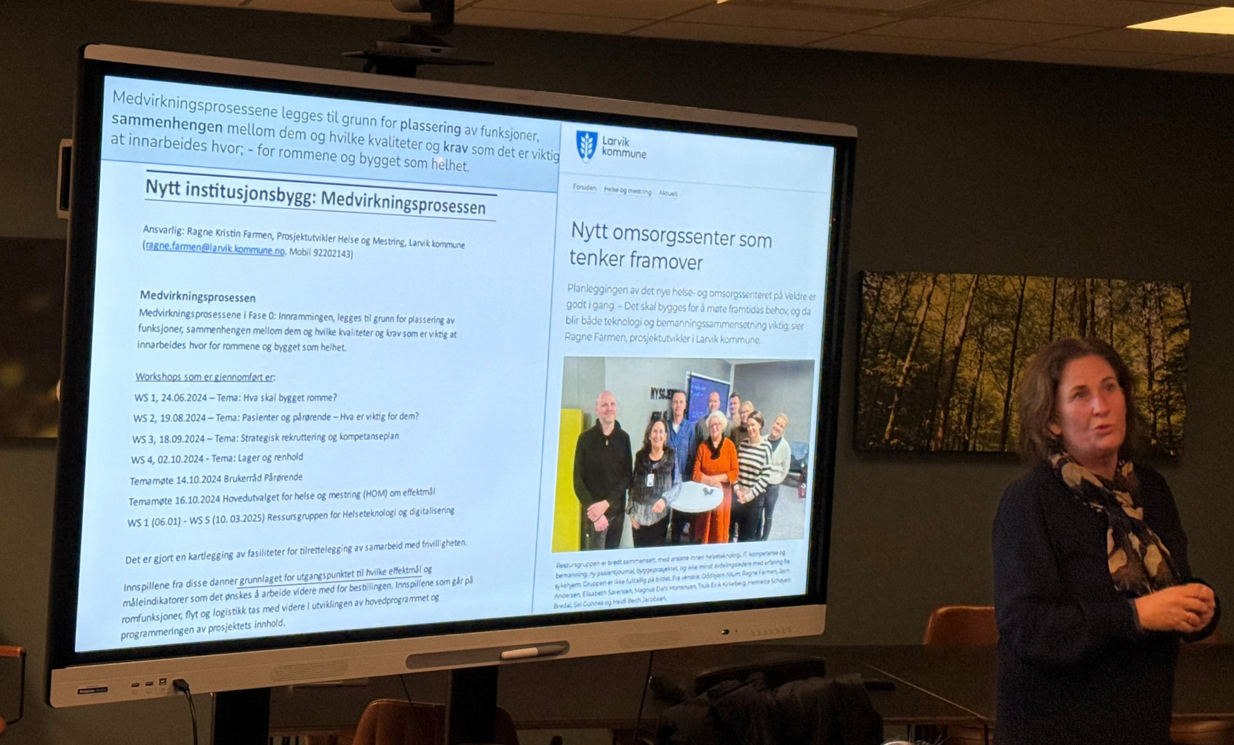 Ragne Farmen, prosjektutvikler i Helse og mestring i Larvik kommune, presenterte planene for byggingen av nytt heldøgns helsenter på Veldre, ny legevakt og nytt rådhus i Larvik. Det nye helsesenteret vil bli norges største og målet er at det skal ha 300 sengeplasser.